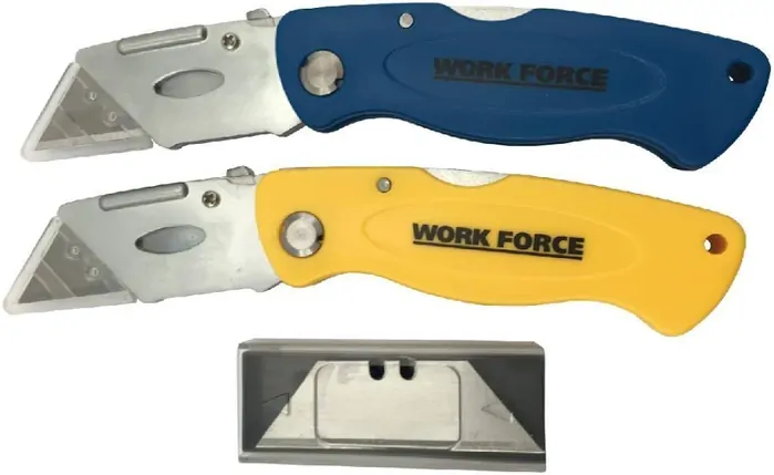 2pce Folding Lock Knives with 5 Blades Quick change mechanism, 5 spare blades included. Safe folding lock back design, lightweight & compact